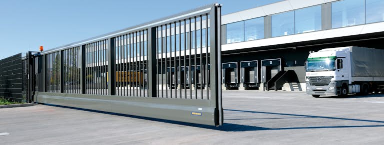 Les portails coulissants Hörmann en profilés d’acier rigides sont livrés en tant qu’ensembles complets avec une largeur de tableau jusqu’à 16 mètres. Il est ainsi possible d’atteindre une largeur de 32 mètres en cas d’installations en vis-à-vis. La construction est autoportante. Les avantages : peu de travaux de fondation, aucun montage de rails de guidage, aucun dysfonctionnement du portail en cas de verglas, de neige ou de salissures. Tous les modèles de porte comprennent de série une fonction de démarrage progressif avec la commande par impulsion pour un démarrage en douceur de la porte : cela ménage la porte et la motorisation.